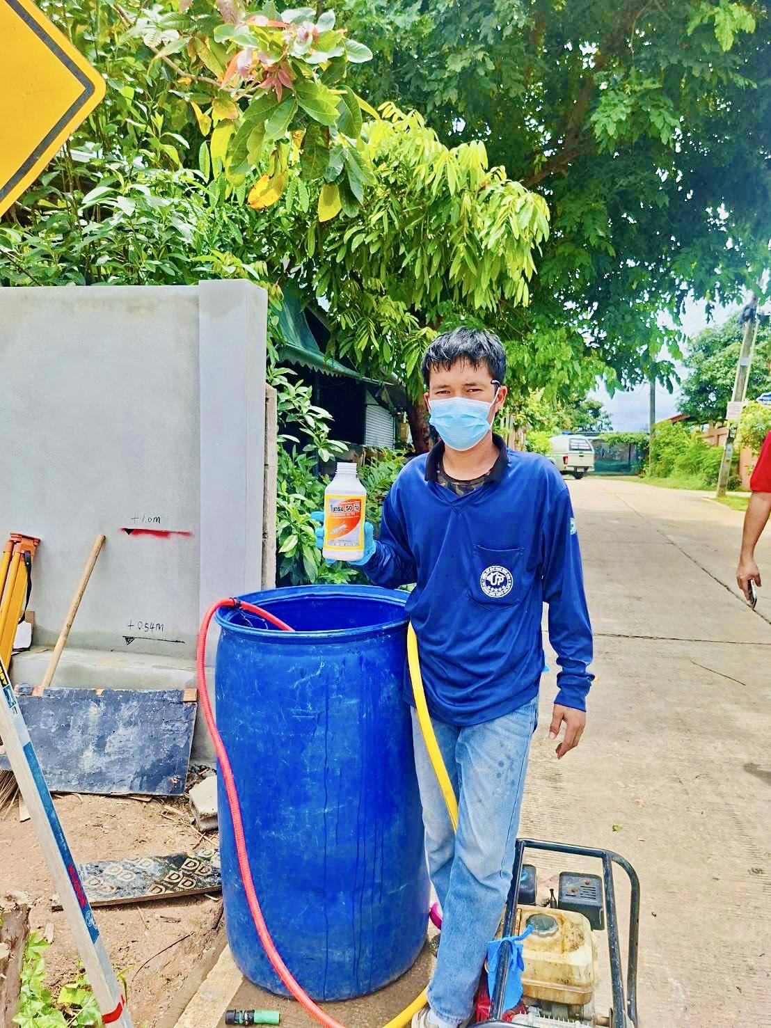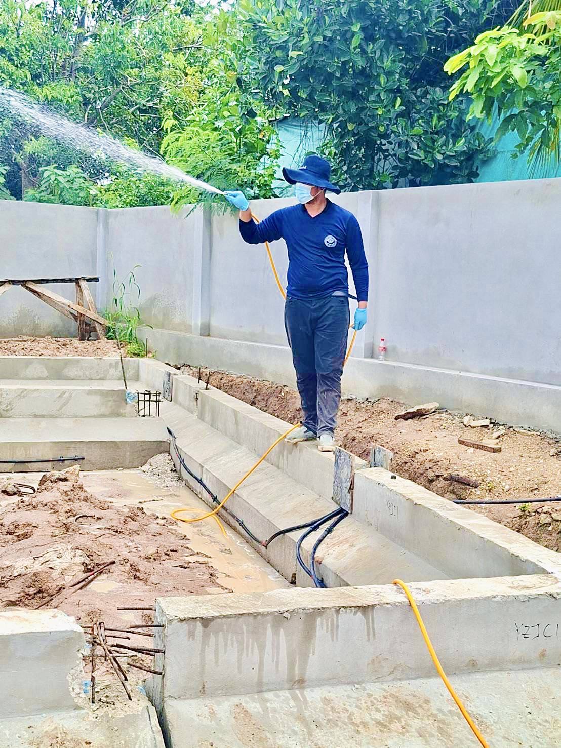 2.หลังจากวางท่อน้ำยาเคมีเรียบร้อยแล้วฝ่ายก่อสร้างสามารถปรับพื้นดินก่อนเทคอนกรีต เจ้าหน้าที่จะทำการอัดน้ำยาภายในตัวบ้านทุกตารางเมตร โดยใช้หัวอัดน้ำยา (High Pressure Injector) ปักลงไปในดินประมาณ 50-100 เซนติเมตร และอัดน้ำยาลงดินตารางเมตรละ 5 ลิตร หลังจากอัดน้ำยาลงดินเรียบร้อยแล้ว เจ้าหน้าที่จะฉีดพ่นสารเคมีพรมหน้าดินอีก 2  ลิตร  ต่อ 1 ตารางเมตร